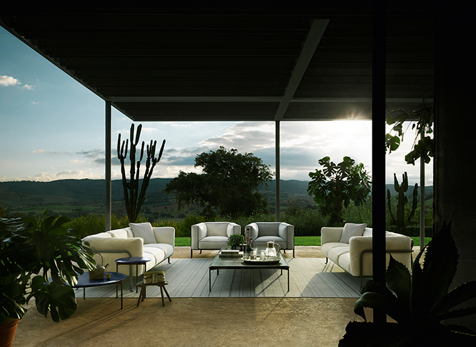 B&B Italia presents Borea, the eclectic and complete collection of outdoor furniture 2021 designed by Piero Lissoni. Portrayed by Tommaso Sartori in the architect’s Maremma country house, the new series of chairs and tables is characterized by the fluid and continuous design of the painted metal structures, by the generous and welcoming kitchens covered with fabrics inspired by the classic cotton canvas striped from yesteryear, in different shades, and for the bright colors of the enamelled lava stone table tops.